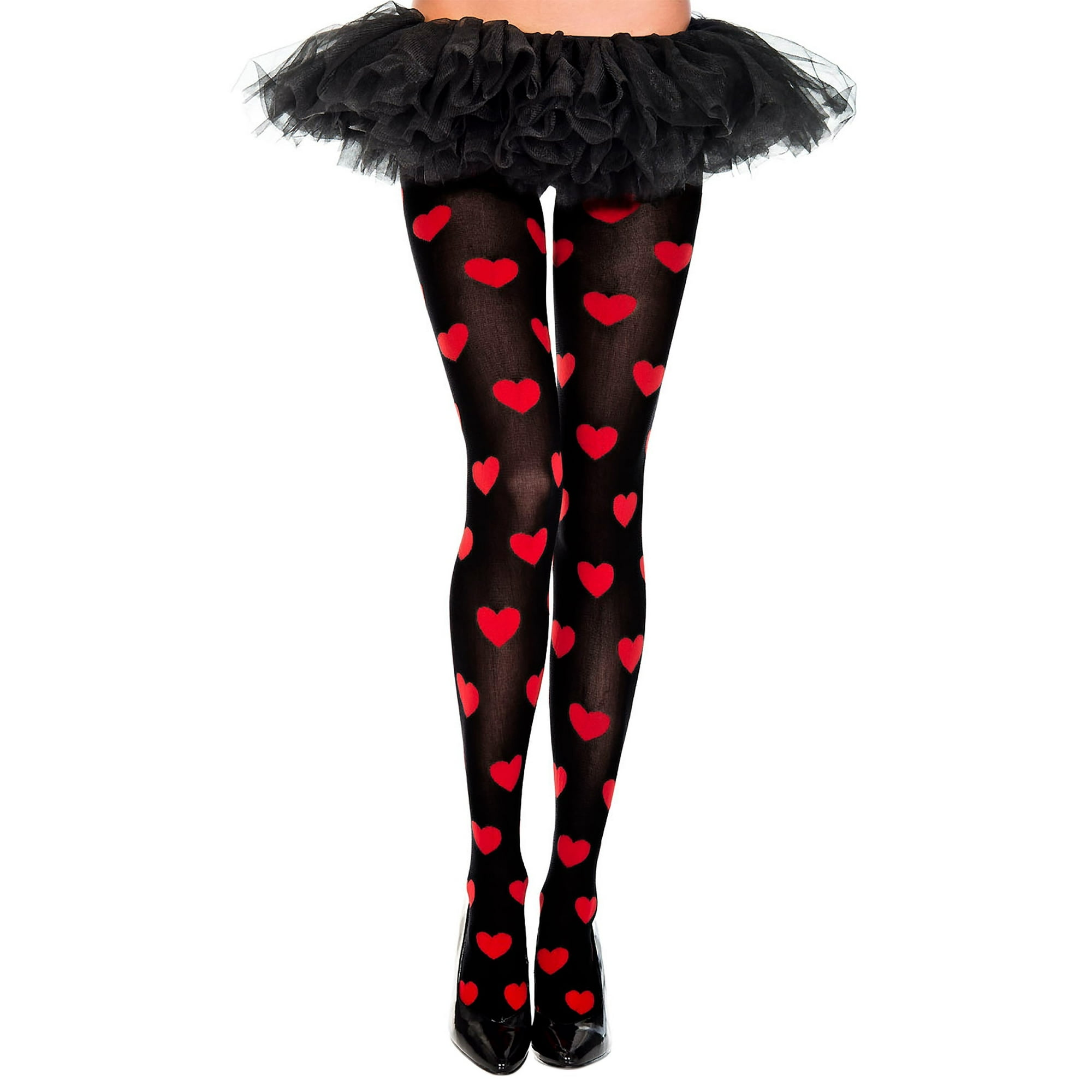Music Legs 677-BLACK-RED Heart Print Spandex Opaque Pantyhose, Black & Red